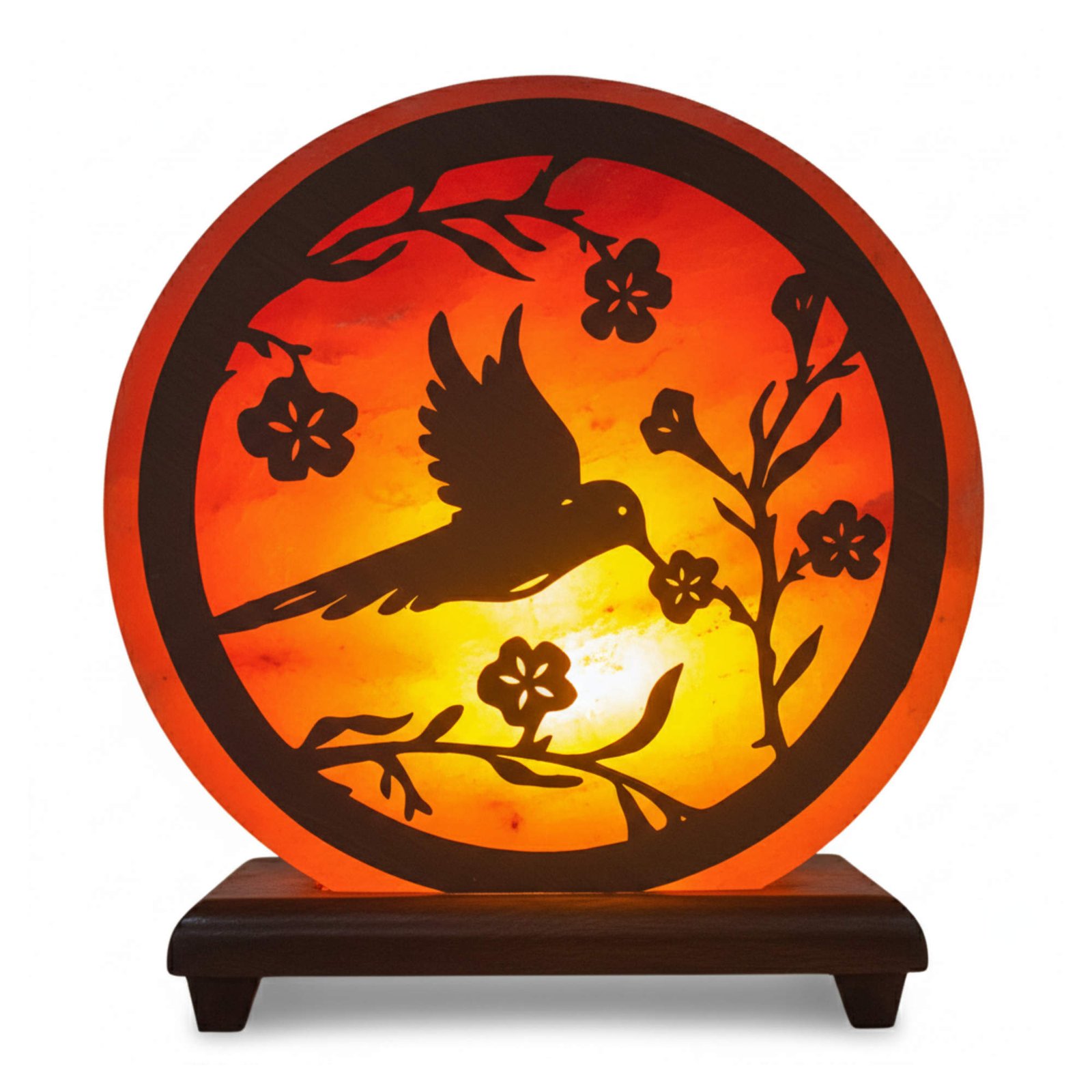 The Flying Bird 3D Himalayan Salt Lamp showcases a detailed cut-out of a bird in motion surrounded by floral elements. When illuminated, the internal glow enhances the silhouette, creating a soft and visually engaging lighting effect. The wooden base provides stability and a premium finish.